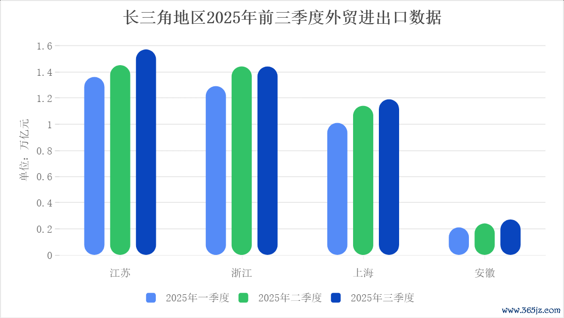 据各地海关数据,前三季度,从进出口增速看,安徽以15.7%领跑,江苏、浙江分别为6.4%、6.2%,上海为5.4%。同期,江苏、浙江、上海、安徽进出口总额分别为4.38万亿元、4.17万亿元、3.34万亿元、7262.5亿元。